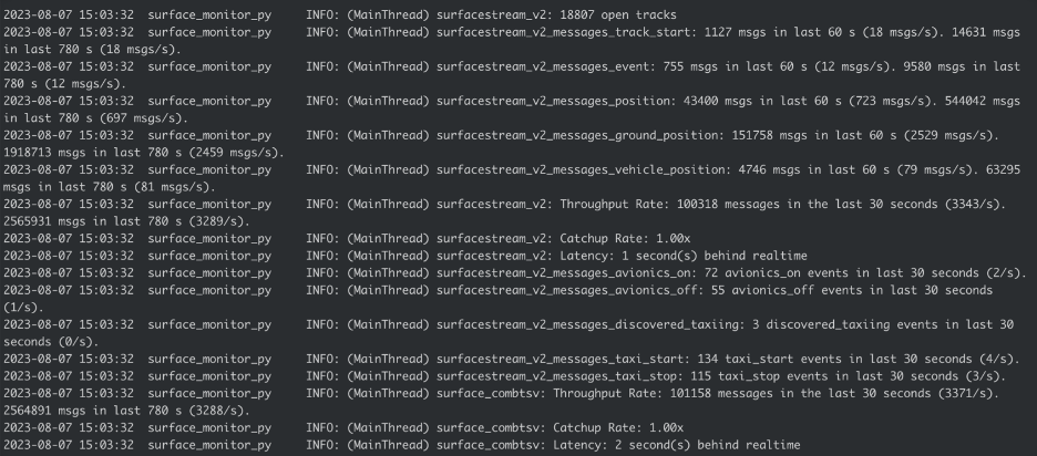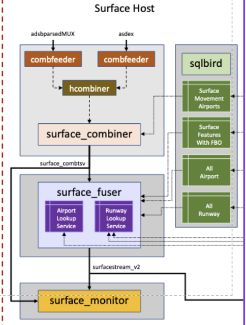 In the image above, you can see an overview of the current architecture for Surface Movement, which contains the programs used to track the surface movement of a flight. Surface Combiner combines and deduplicates ASDE-X and ADS-B daystream feeds, which are outputted by hcombiner, to produce a single input feed for surface_fuser and its format is tab-separated values. Surface Fuser follows combiner output and interprets information such as identifying positions reported for target, and correctly scheduling events in the future. Surface Monitor ingests any number of feeds, but currently, it’s ingesting two feeds which are Surface Fuser, and Surface Combiner. Surface Monitor does simple filtering of the data, and emits every second.