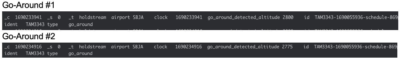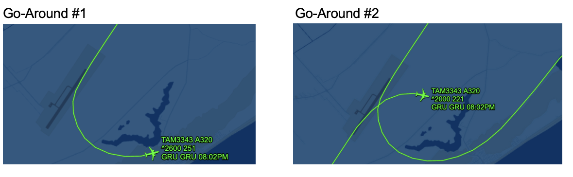 Attached below are 2 images of Flight TAM3343 with each image representing one go-around of the flight, and below those images are the emitted log messages from each go-around.
