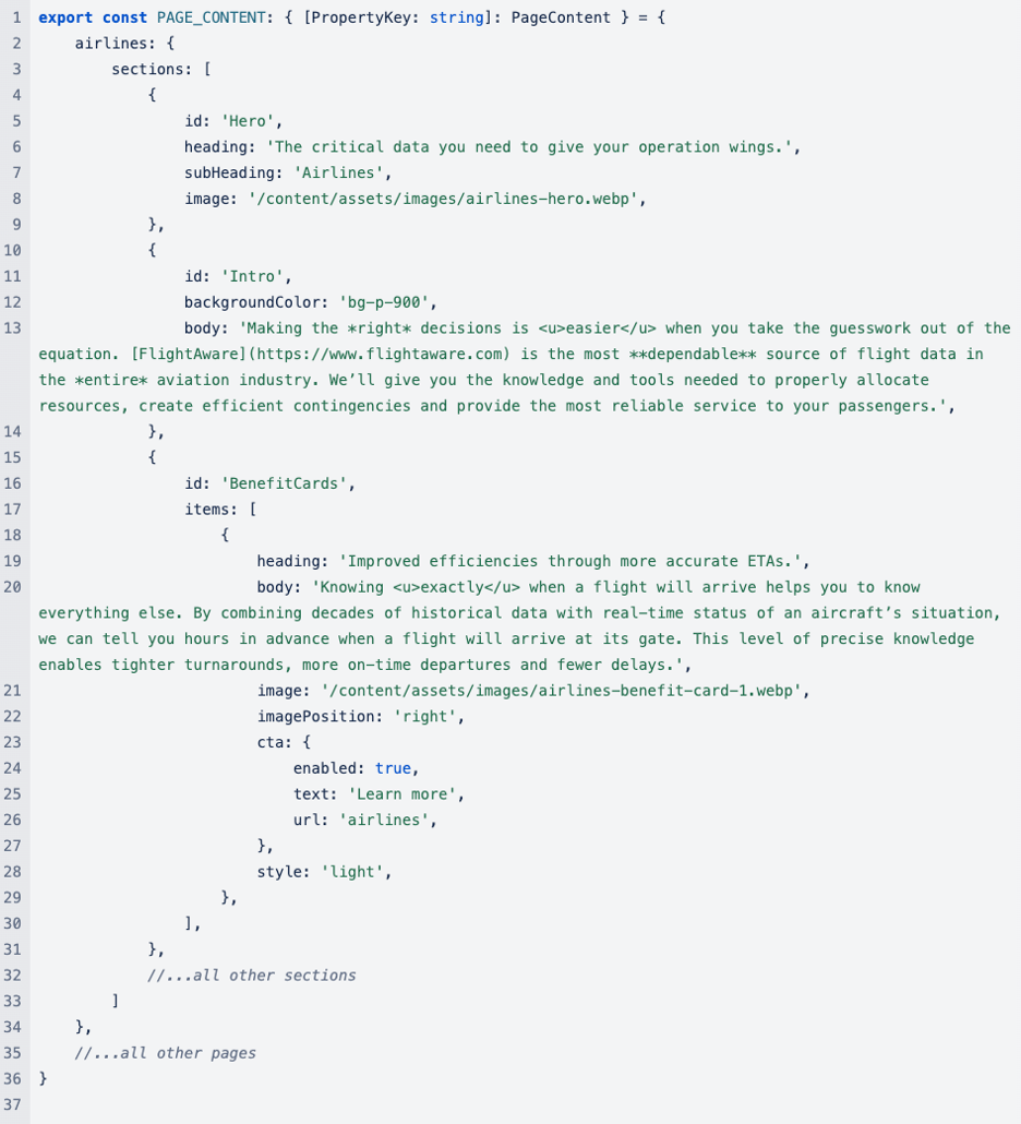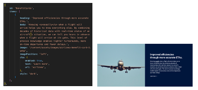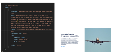 In this example snippet of our industry airlines page, we have an array of sections that are rendered in their respective order, each with their own identifier: Hero, Intro, BenefitCards. These identifiers are used to indicate which component will be used for that set of data. Let’s take our Intro set for example, when it’s time for the Intro component to be rendered, the content generation app will read the id for intro, match that with the corresponding intro component, pass the data into the component, and then render the component with the given text and styling.