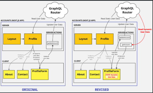 The architecture of each page went through a few iterations, with the first two shown below in simplified form. The orange boxes are Server Components, while the yellow boxes are Client Components. My initial thought was to fetch the user data from the Profile Page and pass it as a prop to the ProfileForm. The user would make some changes to their account and press Submit to send the updates to a Server Action, which would forward the update to the GraphQL Router. Once the GraphQL Router confirmed the update, the Profile Page would refresh.