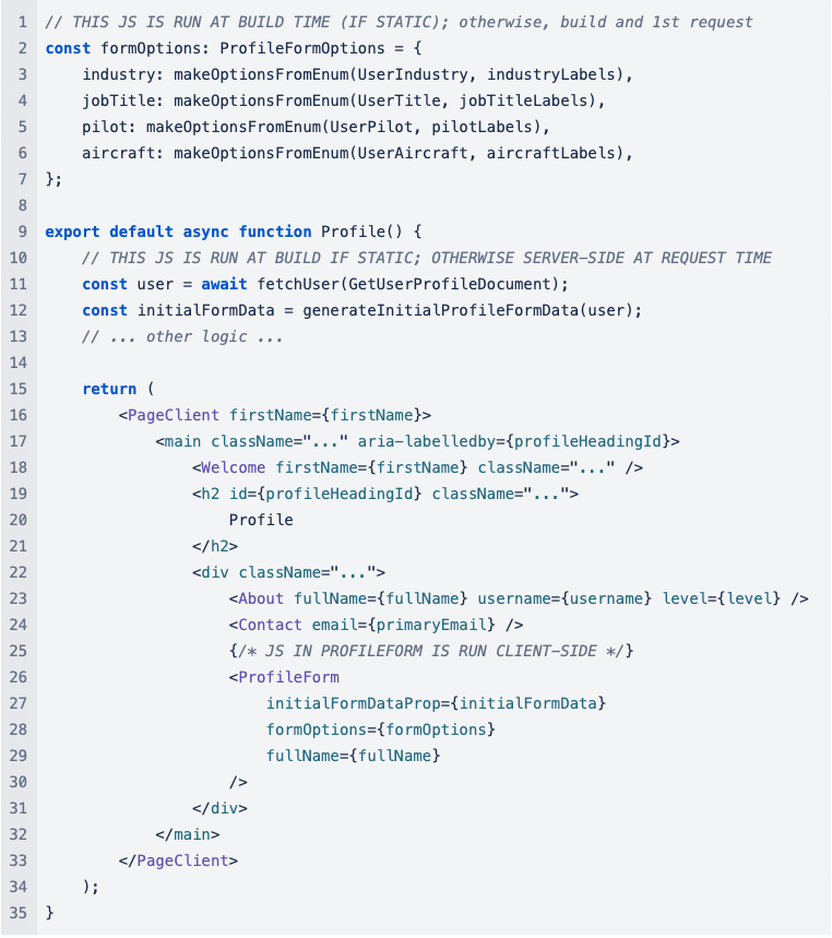 Every decision comes with a tradeoff. The downside to this revision is that more code would be downloaded from the server. Therefore, I ended up implementing a hybrid approach, where the “initial” user data is fetched by the Profile Page on the initial page load and passed to the ProfileForm, which manages the data from there on. This logic is demonstrated in the abbreviated code sample below from the Profile Page Server Component. Note how this takes advantage of Next.js’s seamless way of running JavaScript (JS) code on build, request, or client-side: