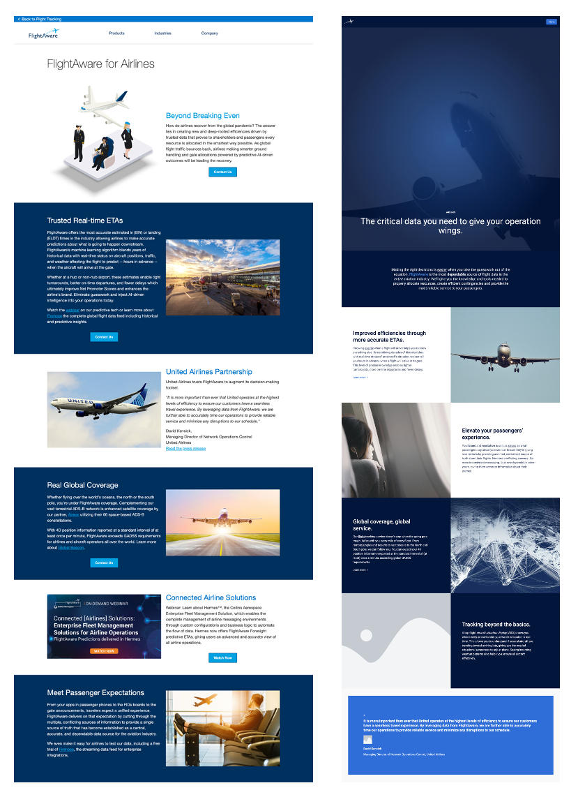 My first assignment was migrating the current industry pages over to the new app. The problem with the old industry pages was that they were hosted by a 3rd party vendor, which made it difficult to align with the rest of the FlightAware site (e.g. adding a new header or any type of custom component would not be possible) and required manually coding each page. The new industry pages would be completely managed within the monorepo--in other words, they (and any future content pages) would now be hosted within FlightAware, along with all the other apps within our monorepo.