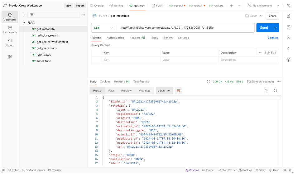 After completing the first functioning iteration of my application, I sought to improve its performance by tackling some of the difficulties in handling data. A significant challenge that I faced while working with the dev server for Redis was that the flight ID’s associated with the eta-streamer’s feature vectors and predictions were different from the flight ID’s associated with firehose’s metadata. So for one particular flight, the Redis keys tagged with eta-streamers’ test flight ID and the Redis keys tagged with Firehose’s production flight ID were different. Fortunately, these flight ID’s had the same flight numbers, and their respective timestamps were off by no more than 10 seconds. After conducting some tests with these observations, I was able to develop an internal function in the API to automatically match the test and production flight IDs for a given en route flight. This made it easier to get Triton predictions and the metadata for the same flight and helped simplify my code.