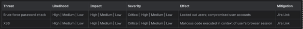For each threat identified and prioritized, we either list existing controls that address the risk, or we add a task to the project’s epic to identify and implement an appropriate response. This provides two key benefits: we can easily tie implemented controls to identified threats with assurance that those controls will exist in the system once completed, and we can integrate security right into the project plan and timeline. This aligns with the mantra of “Shift Left” in the Dev(Sec)Ops ethos.