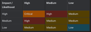 Once all the components and data flows have been examined, we usually end up with a decent list of threats to address. We want to understand the severity of each of these threats so we can prioritize the work to implement mitigations and determine where it needs to fit in the development timeline. Severity can be thought of as the product of likelihood and impact. Despite that definition sounding downright mathematical, this part is as much art as science. Humans are notoriously bad at predicting things, so anywhere you can get hard data from can help, but ultimately, we don’t need to have an actuarial level of precision with these predictions. A simple “high, medium, low” is sufficient for our purposes and we usually delegate the initial analysis to an individual with the whole group providing final review and sign-off. This lets us speed up the process somewhat, while reducing the impact of an individual’s biases.