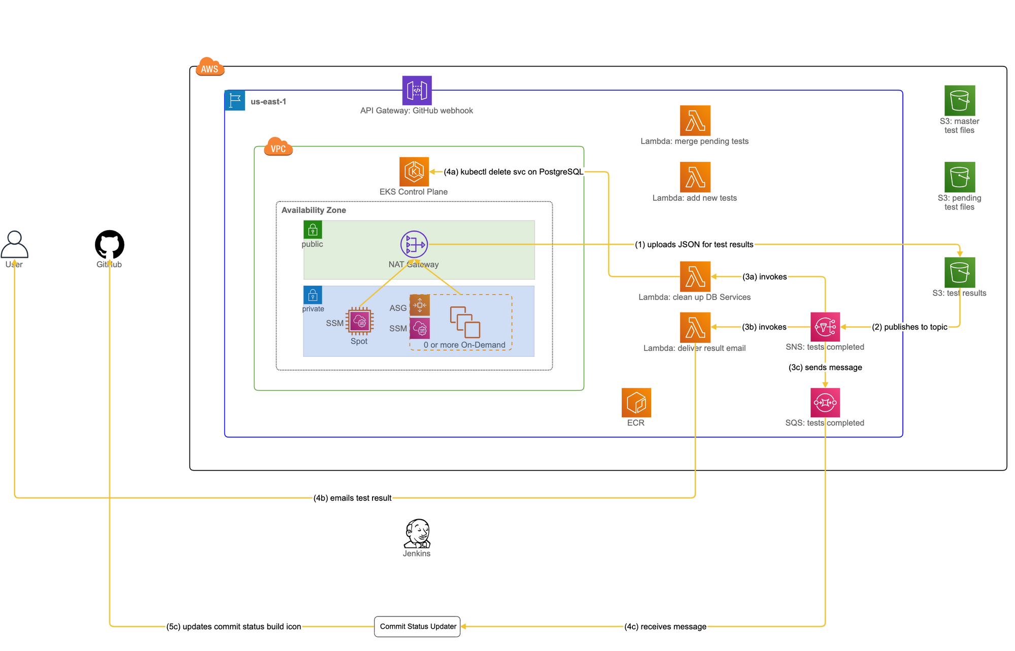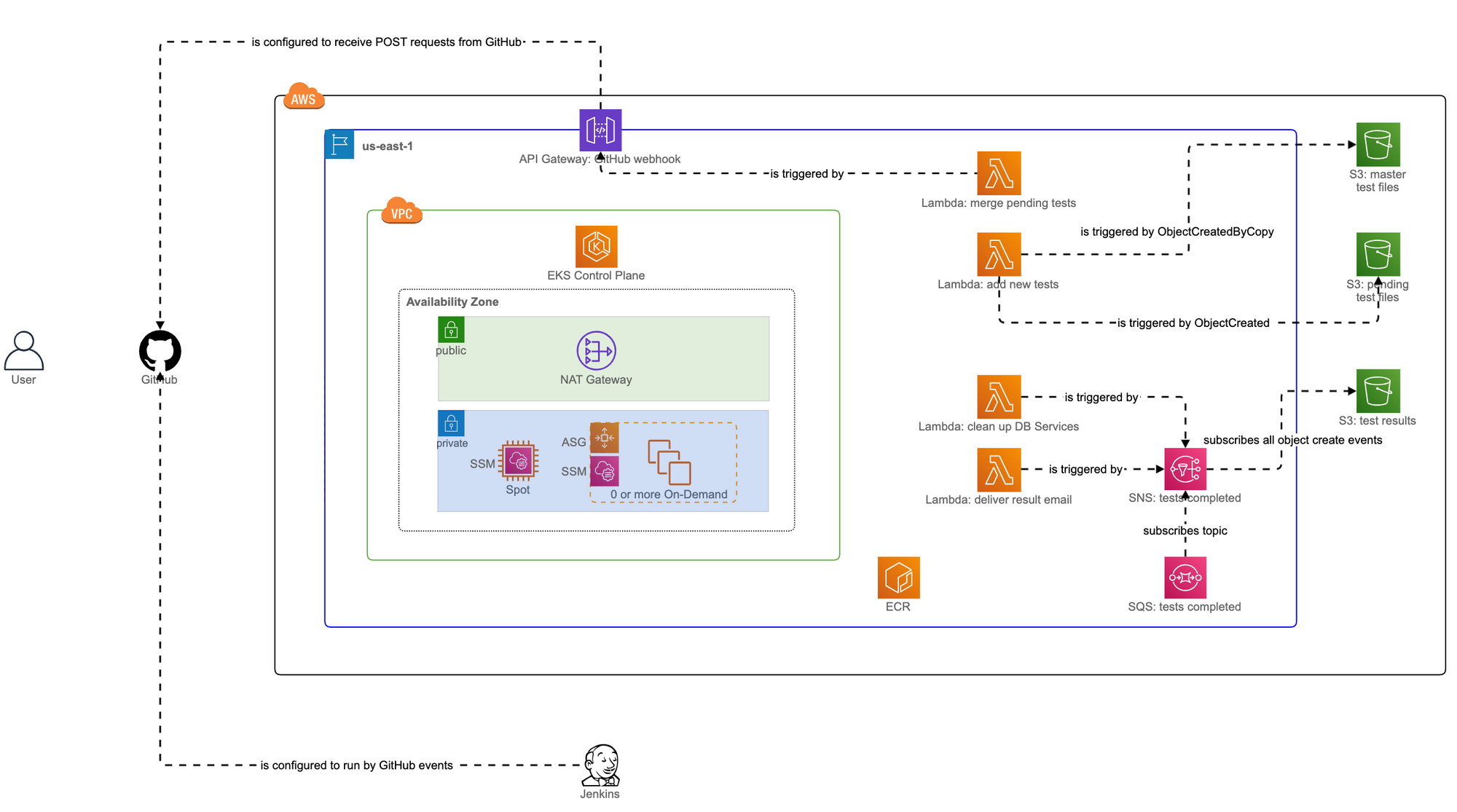 - Test files: stored in the “master tests” S3 bucket and in the “pending tests” S3 bucket
