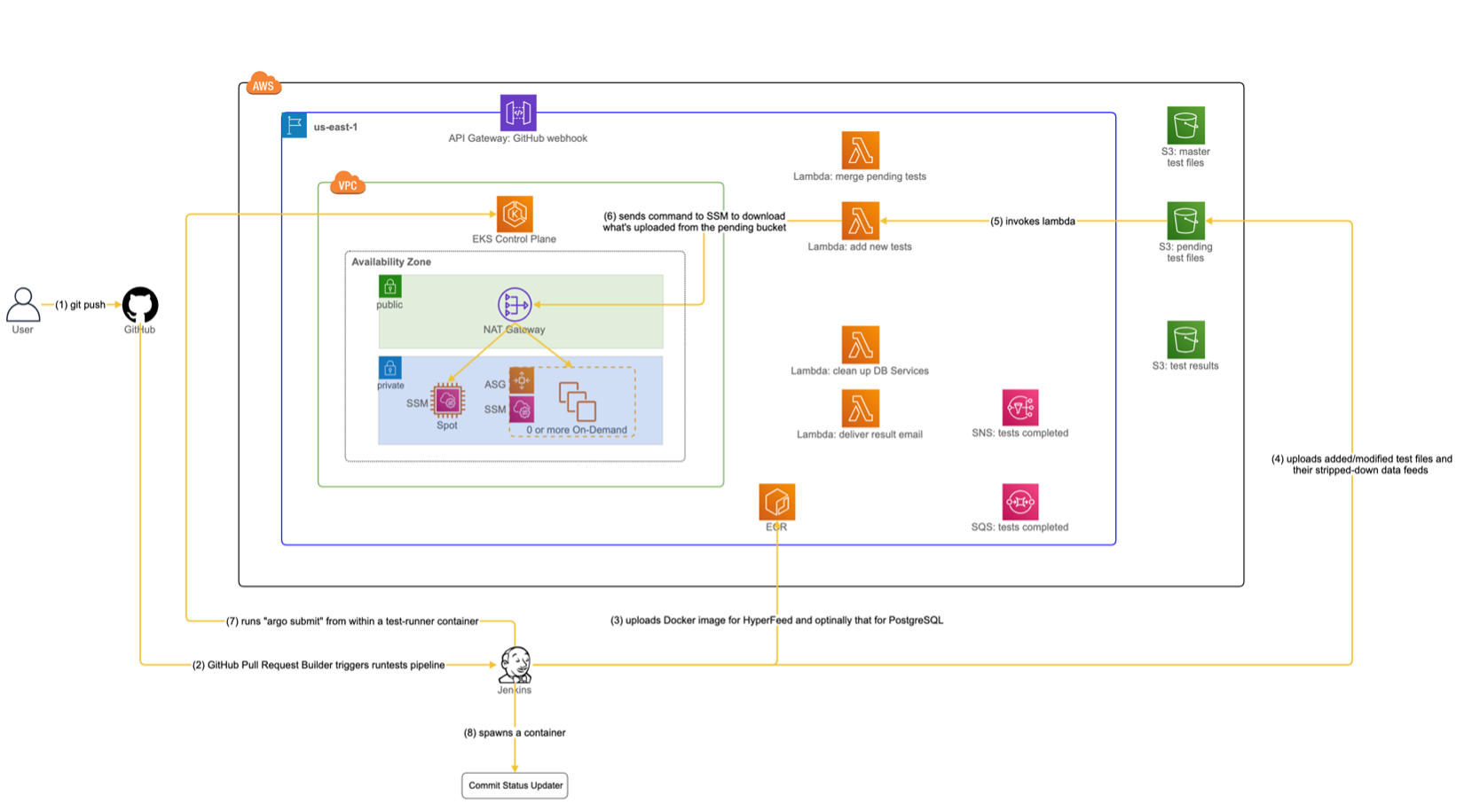 - The execution of the pipeline runs “docker build” to create a new Docker image for HyperFeed containing code changes in the feature branch. It then uploads the resulting image to ECR so that EKS can later fetch it while running the regression tests. Optionally, if the changed files in the PR include a schema update to PostgreSQL, the pipeline execution also builds an updated Docker image for PostgreSQL and uploads it to ECR.