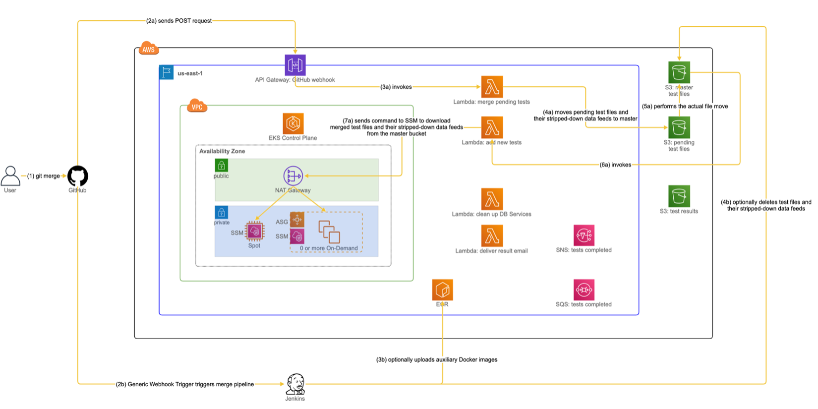 - 5a. The added/modified test files and their stripped-down data feeds are moved from the "pending tests" S3 bucket to the "master tests" S3 bucket.