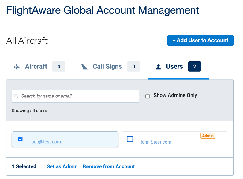 The most direct way a global user can share a flight with others is by adding them to their global account, either as an admin or as a regular user. Admins can interact with the global account with many of the same options as the aircraft owner, while regular users can see the otherwise-blocked flights on the account but cannot edit the account itself. Additionally, users may be grouped with aircraft to control which flights are unblocked for them or be given universal access to view all flights on the global account. Each of these scenarios must be considered for testing if relevant changes are going through.