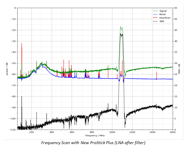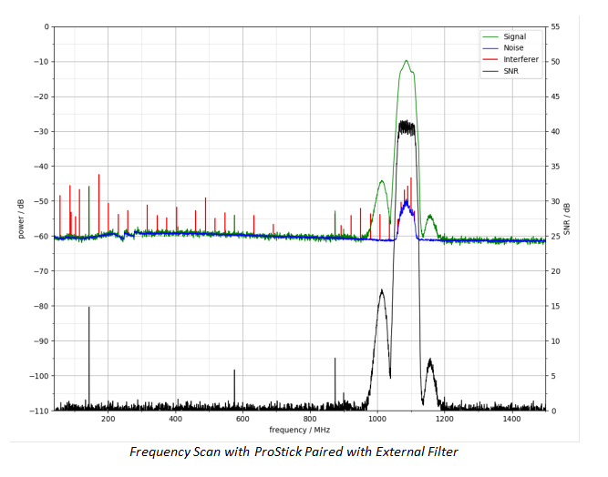 The most important factor among these graphs is the signal-to-noise ratio (the black line). When the test subject receives the sweeping signal from low to high frequency at equal power, the higher SNR means the better reception at that frequency. For ProStick Plus, there are some rejections outside its passing band. For the new alternative ProStick Plus model, it has significantly better rejection outside passing band. For the Pro-Stick paired with External Filter case, the rejections below 900MHz and above 1200MHz are almost perfect.