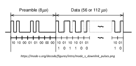 Demodulation extracts the original information from a carrier wave into a stream of bytes. The main thread of dump1090-fa consumes the data from the shared FIFO queue and sends the sample buffers to the demodulator. The demodulator scans through the input buffer for an 8 µs preamble for a series of pulses with specific timings known as the Mode-S preamble (see diagram below). If a preamble is found, it demodulates the remaining data block and conducts some extra validation to determine if this is a valid Mode-S message.