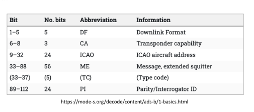 At this point, the Mode-S message has been demodulated into a stream of bytes to be decoded. The first 5 bits of the data block are known as the format code, which we can use to determine how to process the rest of the message. We are particularly interested in 112-bit Extended Squitter messages, which is used by Automatic Dependent Surveillance-Broadcast (ADS-B) systems to transmit position, velocity, identification, etc. information. These messages have a Downlink format code of 17 (DF17). The full breakdown of ADS-B message bits is shown in the table below.
