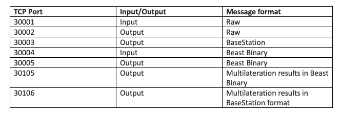 MSG,4,1,1,AB674B,1,2022/04/02,01:56:36.968,2022/04/02,01:56:36.986,,,475,83,,,640,,,,,0 Depending on what type of format a client application needs, they can make TCP connections to the appropriate ports to stream the data. Notably, our piaware client connects to Port 30005 for aircraft data in beast binary format to process and upload to FlightAware. The table below shows all the available ports and their respective data formats.