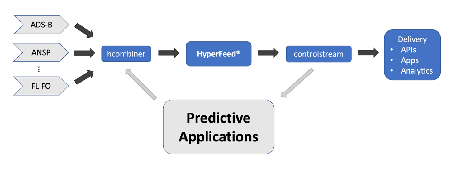 FlightAware data flow begins in various data feeds—FlightAware processes information from sources including air navigation service providers (ANSPs), space-based ADS-B, and FlightAware’s own global network of over 30,000 terrestrial ADS-B receivers. hcombiner is the program responsible for combining these various feeds into a single input, which HyperFeed, FlightAware’s proprietary flight decision engine, then fuses and synchronizes to produce controlstream, the single source of truth for aircraft positions. controlstream is where the Predict Crew’s various streaming applications begin—and where predictions are ultimately sent.
