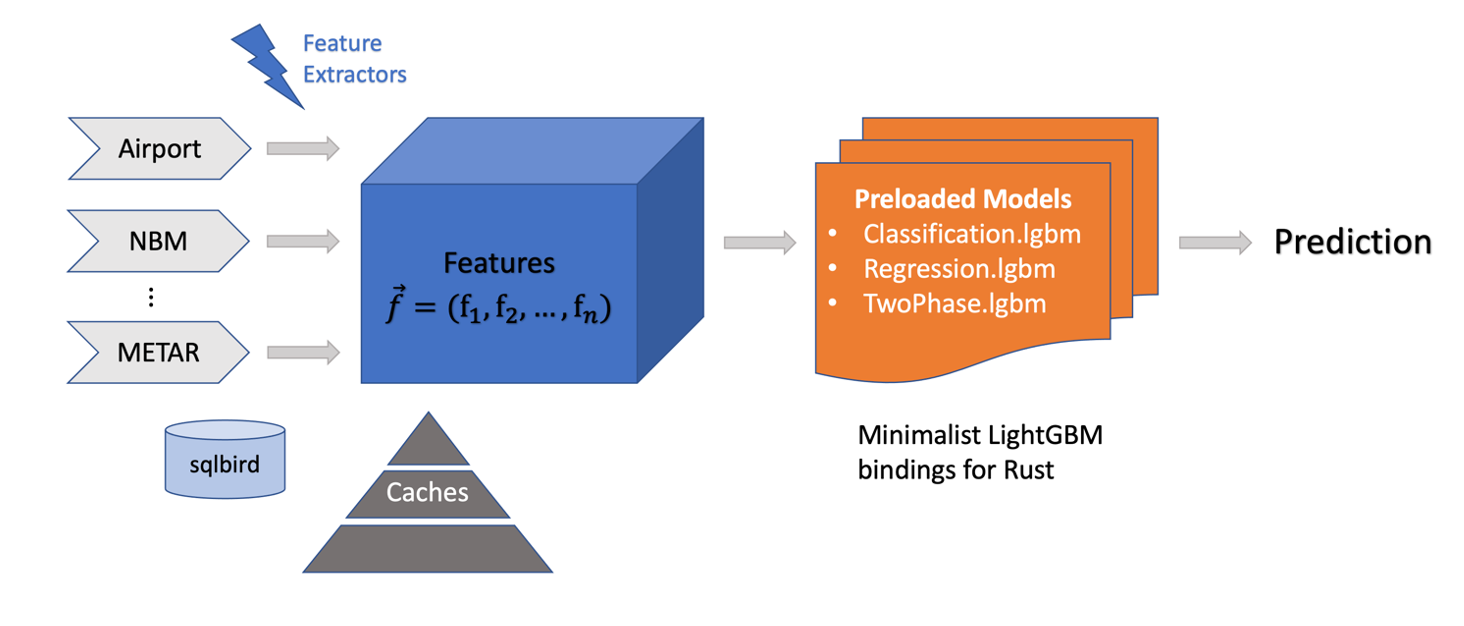 Various LRU and time-based caches store information about the innumerable flights and aircrafts that the streamer processes, and information that comprise the feature vectors, including various traffic metrics, data from the National Oceanic and Atmospheric Administration, and METeorological Aerodrome Reports (METARs). Additionally, state variables containing information about virtual clocks or model features also facilitate communication between threads. As the streamer runs, feature extractors—functions that consume a flight’s state and return a relevant derived feature—build the final feature vector that is consumed by the machine learning model.
