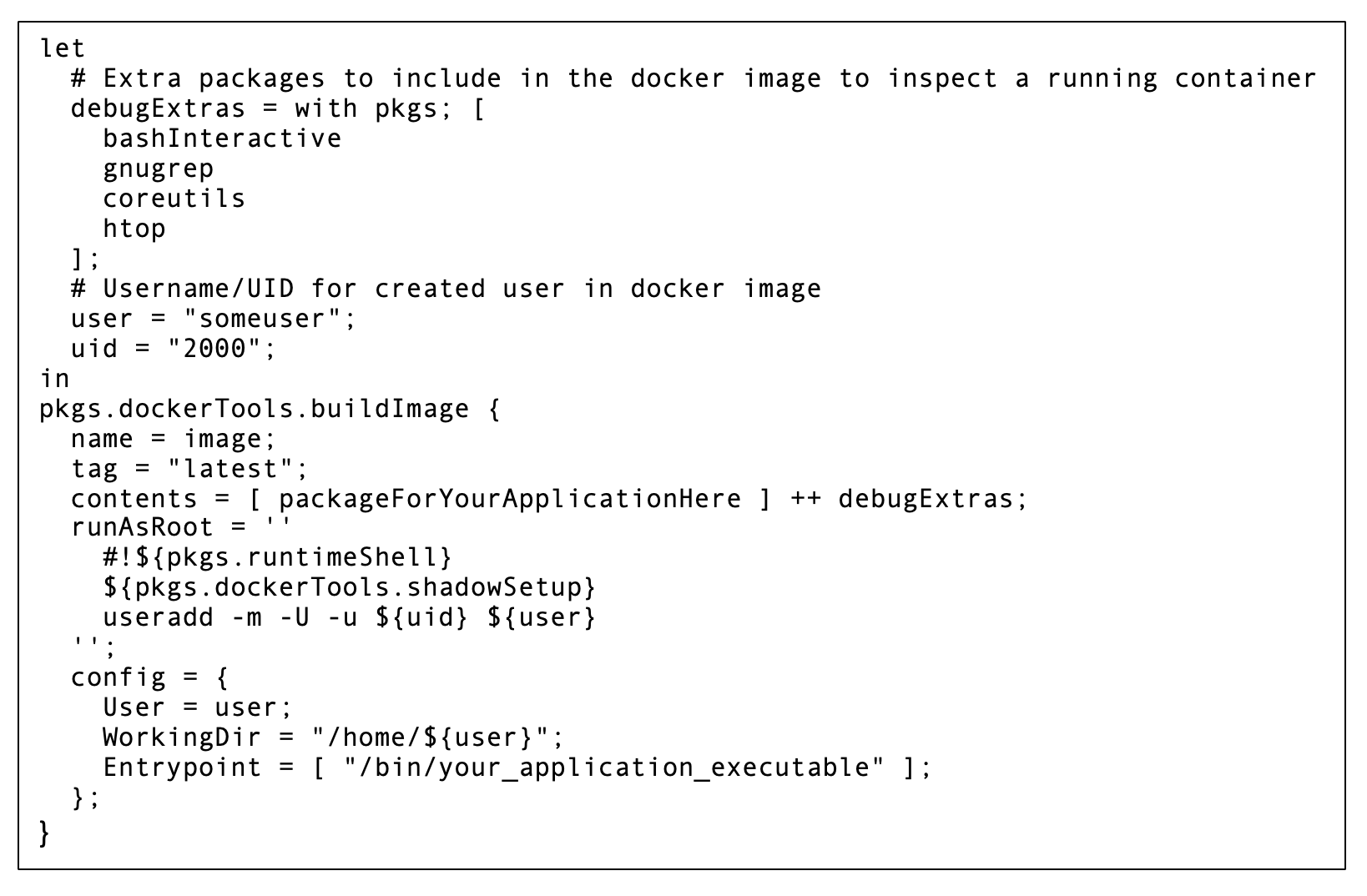 For example, here’s how a Nix language expression would look like to define a single layer Docker image with some application, an interactive shell for debugging, and basic user setup, from scratch: