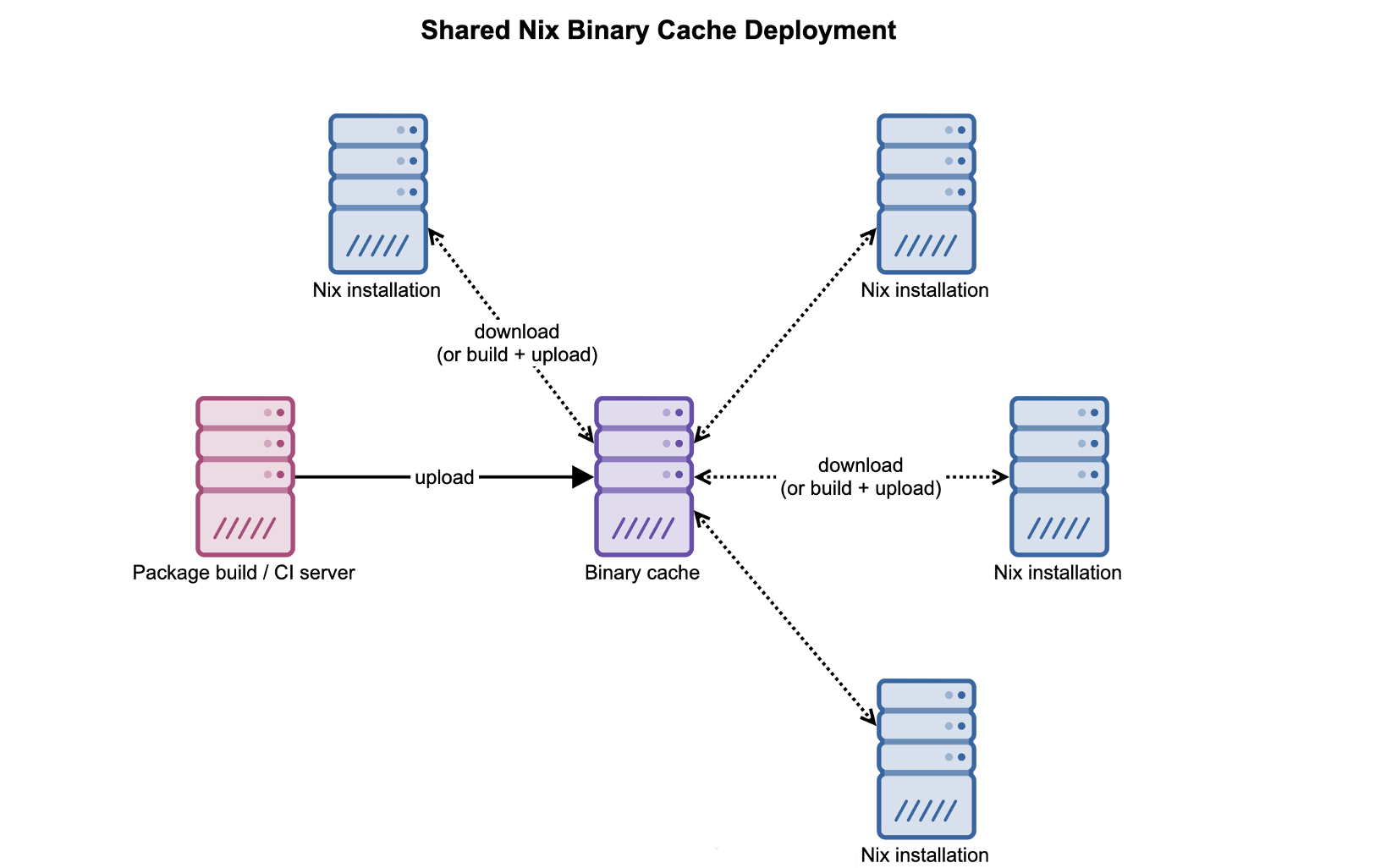 There’s one important and nuanced detail that we’ve glossed over so far: we’ve said very little about how already built Nix packages are distributed -- after all, we don’t want to waste time recompiling packages if we can avoid it. This is where binary cache servers come into play.