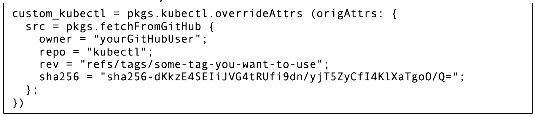 Once you’re familiar with the Nix DSL, it’s surprisingly easy to arbitrarily tweak or experiment with variations on packages. It’s particularly easy to describe a new package in terms of an existing one within the Nix language. For example, let’s say you’d forked the kubectl GitHub repo and made a few tweaks. If you want a Nix package for your “custom kubectl” you can define it in terms of the existing one, keeping all old build/configure/install steps, except the source code will come from your fork instead: