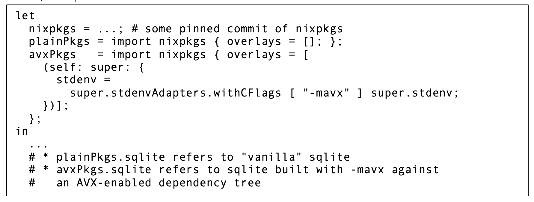 Additionally, Nix’s overlay mechanism makes it easy to experiment with changes that span large swaths of the entire package set in a way that’s inconvenient or even unthinkable to do with a more conventional package manager. For example, suppose that you want to test the performance impact of enabling the AVX ISA extension across all C/C++ packages. Nix makes this trivial: in just a few lines of the Nix language, you can define and apply a package overlay that modifies the compiler flags used in the standard build environment and let Nix call all existing package definitions again with that new build environment.