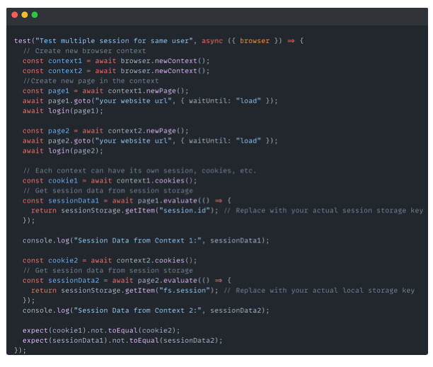 Here’s a very simple example demonstrating how to use browser contexts in Playwright. This example creates multiple browser contexts within a single test and verifies that the sessions and cookies are distinct for each page.